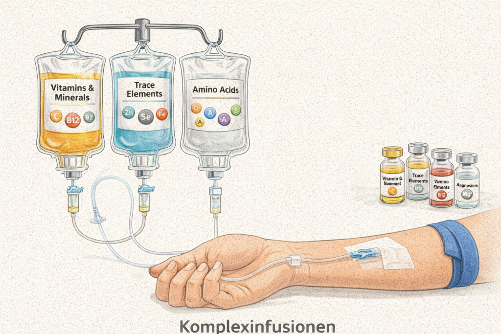 Komplexinfusionen sind Infusionen, die eine Kombination verschiedener Vitamine, Mineralstoffe, Spurenelemente oder Medikamente enthalten. Sie werden direkt über die Vene in den Blutkreislauf gegeben. Dadurch stehen die Wirkstoffe dem Körper sofort und in höherer Konzentration zur Verfügung.