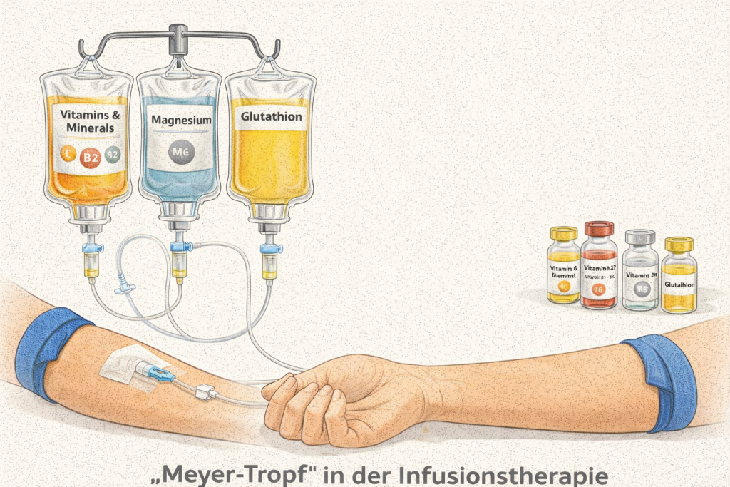 Der sogenannte Meyer-Tropf (engl. Myers’ Cocktail) ist eine spezielle Infusion, die eine Kombination aus Vitaminen, Mineralstoffen und Spurenelementen enthält. Er wird direkt über die Vene verabreicht, sodass die Inhaltsstoffe sofort und in höherer Konzentration in den Blutkreislauf gelangen.
