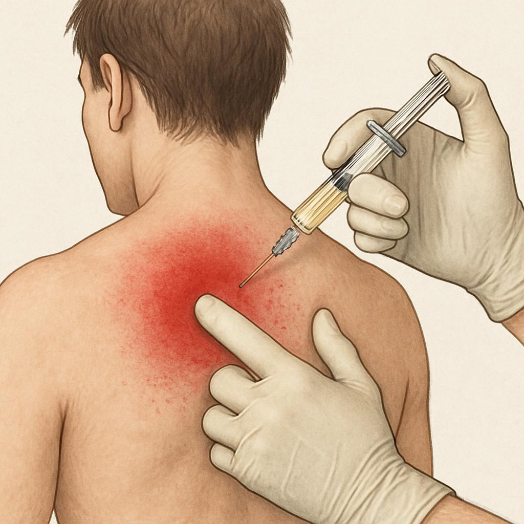 Bei der Triggerpunktinfiltration spritzt die Ärztin/der Arzt ein Medikament direkt in diesen verspannten Punkt. Meist wird ein örtliches Betäubungsmittel (z. B. Lidocain) verwendet, manchmal auch ein entzündungshemmendes Mittel (Kortison).
