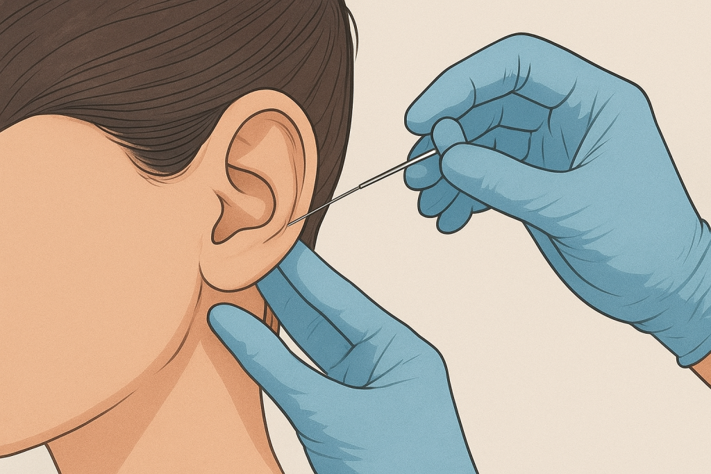 - Nach einem kurzen Gespräch werden geeignete Punkte am Ohr bestimmt.